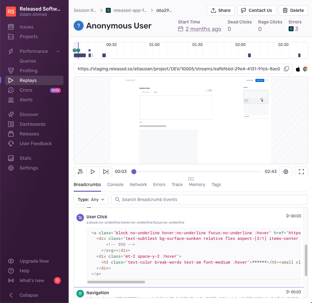 Before Sentry, the team would approach debugging errors based on a description of actions the user took and the problem they saw. It was a lot of effort to tease out which things were relevant in the environment. For example, was the network connection spotty for this failure? Was it related to the browser they were using? Knowing this often required multiple iterations of deploying new logs to track down the cause of an error. Released.so needed a more efficient way to know when and why errors happened.