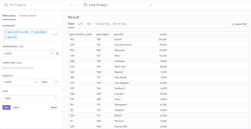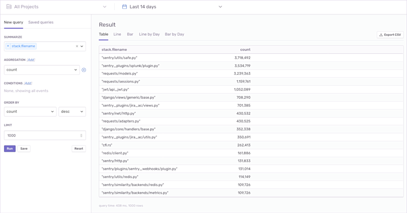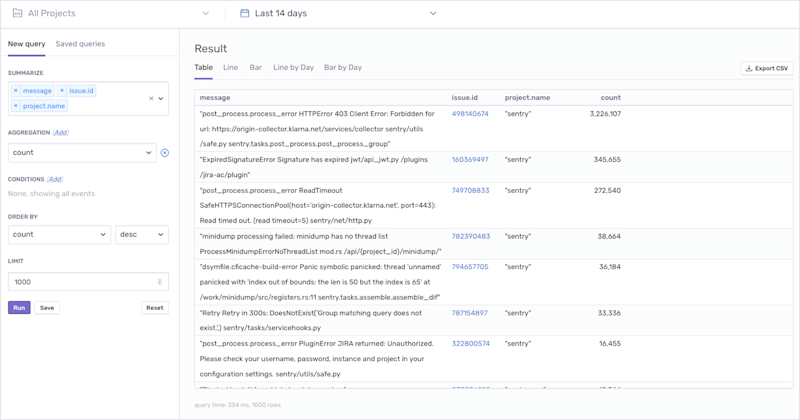 Sentry Discover is the foundation for querying raw event data in Sentry, across all projects. It's particularly valuable when you've enriched your event data because you can run queries based on your customized event context. Use Discover to build and save queries that are helpful to you in identifying trends in issues. Here are a few things that you can do using Discover: